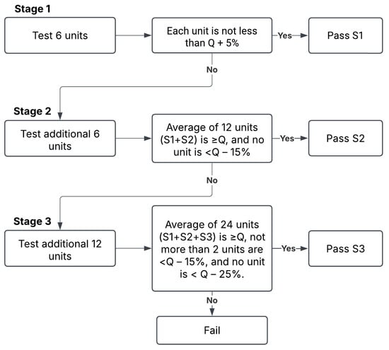 The dissolution test was performed per the USP monograph for furosemide tablets [39] using USP dissolution apparatus II (PT-DT70, Pharma Test, Hainburg, Germany). The apparatus was set to 50 rpm, and the dissolution medium was 900 mL phosphate buffer (pH 5.8) maintained at 37 ± 0.5 °C. A 5 mL suspension sample was removed and transferred to the dissolution medium vessel. Samples of 5 mL were withdrawn from the zone midway between the dissolving medium surface and the top of the rotating blade at 5, 10, 20, 30, and 60 min intervals and immediately filtered through a 0.22 μm filter to remove any particulate matter. The removed aliquots were immediately replaced with 5 mL of fresh medium at 37 °C to maintain a consistent volume of the medium. The samples were assayed with UV spectrophotometry (Libra S22 UV/Vis., Biochrom Ltd., Cambridge, UK) at a wavelength of 270 nm. The acceptance criteria for dissolution were established according to the USP guidelines for immediate release dosage forms using a three-stage approach (S1, S2, and S3) to determine compliance. The criteria are summarized in Figure 8. Quantity (Q) represents the percentage of the labeled content of the dosage unit that is dissolved at a specified time. For this study, the dissolution specification was set at Q = 80% of the label claim in 60 min, as specified in the furosemide USP monograph [39]. While dissolution testing is primarily used to assess solid dosage forms, it was used in this study to assess the in vitro drug release behavior of furosemide suspensions, and to permit the comparison of furosemide release across the different vehicles.