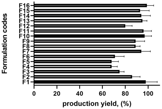 The production yield across all batches ranged from 68.36 ± 0.98% to 98.58 ± 0.64%, significantly influenced by the drug-to-polymer ratio and polyvinyl alcohol (PVA) concentration (Figure 1). An increase in the drug-to-polymer ratio led to a higher production yield. For instance, at a 1:15 drug-to-polymer ratio (F4), the production yield was relatively low (68.3%), whereas at a 1:22 ratio (F16), it reached 98.9%.