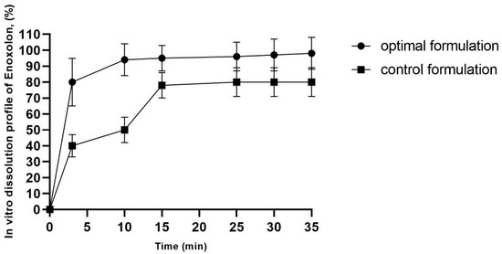 The drug release profiles of the optimal enoxolon microsponge (the optimal enoxolon microsponge formulation contains 0.1% of enoxolon, 1.094% of methyl cellulose, 0.67% of polyvinyl alcohol, and 2.14% of Tween 80, and is dispersed in 1% MC solution) and control formulations (0.1% of enoxolon dispersed in 1% MC solution) are depicted in Figure 2. The release mechanism can be attributed to the porous structure of the microsponges, which facilitates the penetration of the dissolution medium and enhances access to the entrapped drug molecules [24].