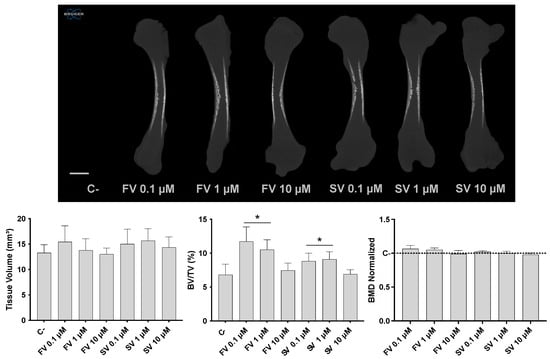 Micro-CT analysis revealed distinct effects in bone morphometric parameters following statin treatment (Figure 1). Tissue volume (TV) remained relatively consistent across all experimental groups, indicating that overall femur size was not significantly influenced by the treatments. On the other hand, the bone volume fraction (BV/TV) was significantly increased in femora treated with FV and SV at 0.1 and 1 μM, indicating an elevated proportion of mineralized bone relative to the total tissue volume. Notably, bone mineral density (BMD) remained comparable across all groups, with no significant differences relative to the control.