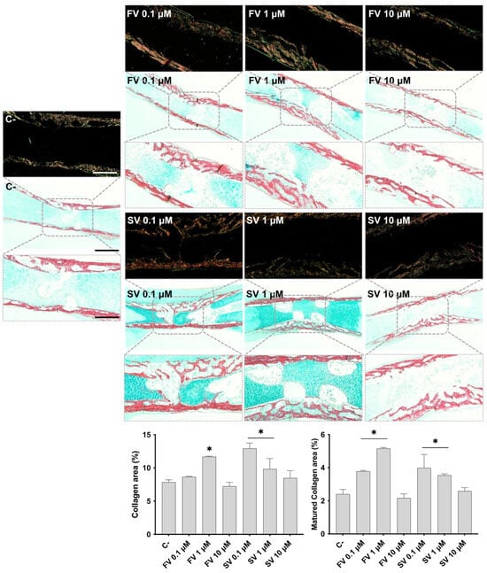 Femora cultivated in all conditions were analyzed by histochemical staining, with a particular emphasis on the diaphyseal region. Figure 2 shows representative tissue sections stained with Alcian blue (AS), highlighting the proteoglycan-rich cartilage matrix, and Sirius red (SR), marking the collagenous matrix distribution. In control samples, the development of a collagenous matrix from the periosteal region progressing centripetally into to the inner region is noteworthy, extending from the mid-diaphyseal region into the epiphysis, as revealed by SR staining, forming a trabecular-like arrangement. Meanwhile, the bluish staining of the proteoglycan-rich cartilage matrix can still be seen in the innermost section of the diaphysis. Femora exposed to FV, particularly at lower concentrations (0.1 μM and 1 μM), exhibited a more mature and developed collagenous matrix within the diaphyseal region. At 0.1 μM, the collagen matrix appeared slightly thicker, with enhanced trabecular organization. This effect was maintained at 1 μM, with increased matrix deposition and a well-structured trabecular pattern. At 10 μM, a similar trend was observed, although the degree of trabecular organization appeared less pronounced compared to the lower concentrations. Femora treated with SV also exhibited features indicative of a more mature and developed collagenous matrix, particularly at lower concentrations. At 0.1 μM, samples showed a marked increase in SR-stained areas, accompanied by an expanded central region of the diaphysis with evident cell migration and trabecular organization. This trend was also evident at 1 μM, where increased matrix deposition and trabecular structuring were observed, although to a slightly lesser extent than at 0.1 μM. In contrast, femora exposed to 10 μM SV displayed a collagenous matrix organization comparable to that of the control, with limited evidence of further trabecular development. The histological appearance of the femora is consistent with the quantitative histochemical analysis of the collagenous area. The increased intensity and distribution of SR staining observed in samples treated with lower concentrations of both FV and SV align with the quantitative data, which indicate an expansion of the collagen-rich matrix.
