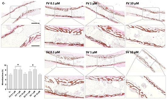 Representative images of Von Kossa (VK) staining of mineralized matrix. The graph refers to the quantitative analysis of the stained area. * p ≤ 0.05 vs. control. FV 10 µM and SV 10 µM. Scale bar corresponds to 100 µm or 200 µm upon selected insets.