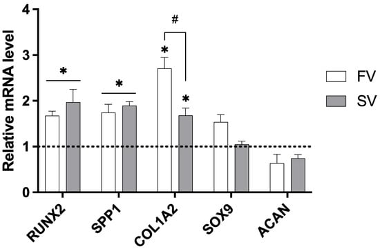 Relative gene expression of osteogenic and chondrogenic markers in cultures treated with 1 µM simvastatin or fluvastatin. Expression levels normalized to GAPDH. * p ≤ 0.05 vs. control; # p ≤ 0.05 vs. the other statin-treated group.