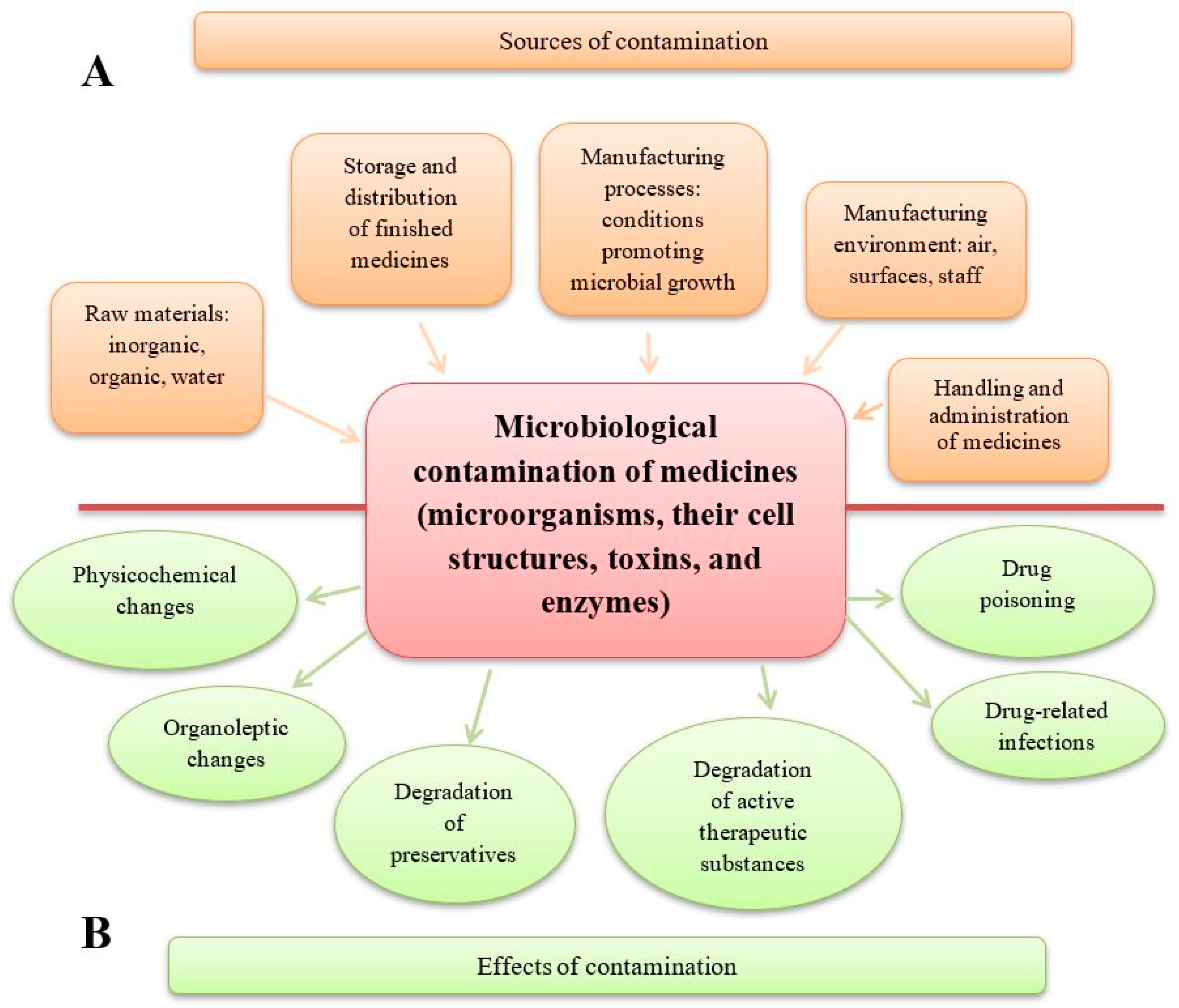 - * A reduction in patient safety. This includes drug-related infections caused by the presence of live pathogenic microorganisms in medicinal products and medical devices used for drug administration. When a contaminated drug is administered, microorganisms can grow, multiply, and release toxic substances in the patient’s body. Drug poisoning, on the other hand, is caused by cellular and extracellular factors—primarily toxins and enzymes—produced by microorganisms that were present in the raw materials and the finished product. In such cases, live microbial cells may no longer be present, so an infection does not occur [3,7,8,9,10,11].