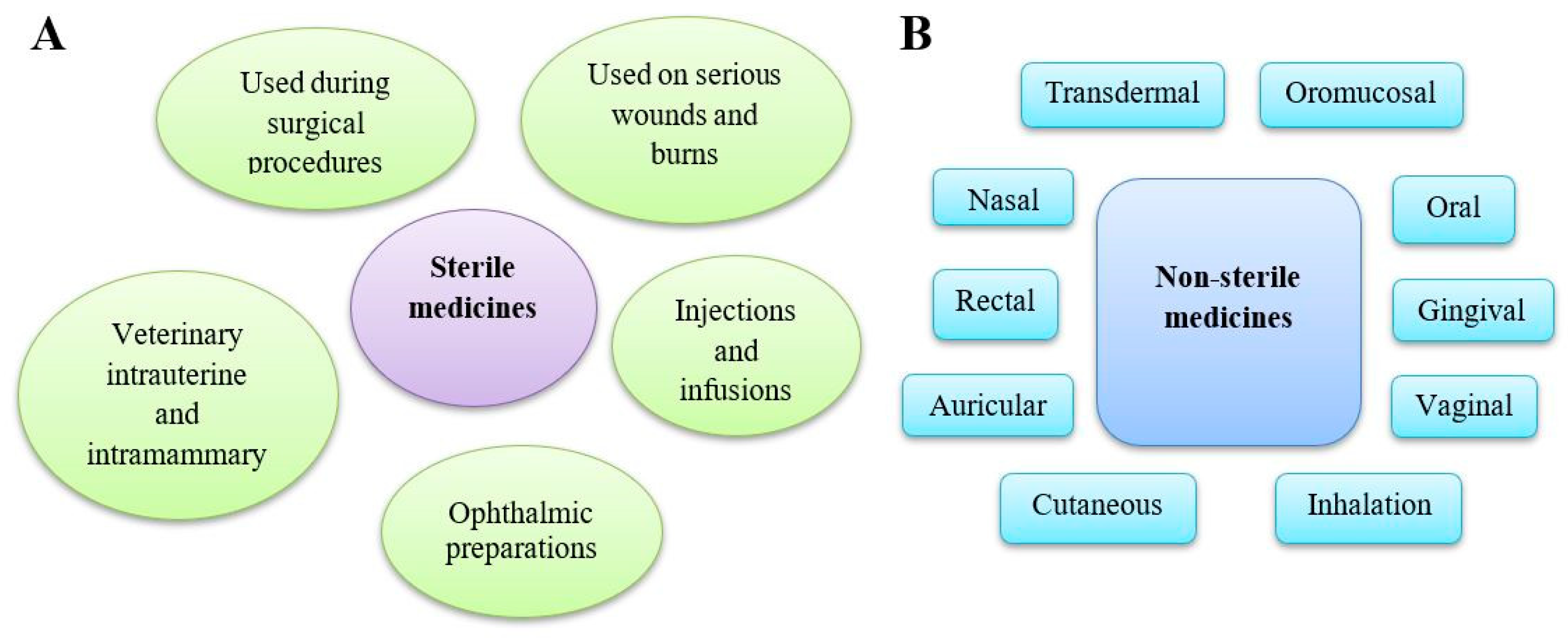 - Murtaza, G.; Khan, M.A.; Nisa, Z.U.; Shafiq, S. A review on the microbial contamination in the non-sterile pharmaceutical products. Pharm. Sci. Technol. 2021, 5, 68–75. [Google Scholar] [CrossRef]