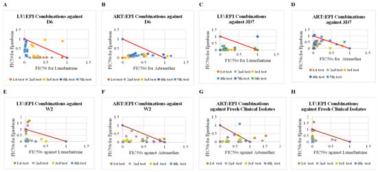 Interaction profiles of artemether and lumefantrine combinations with epirubicin against clinical isolates and cultured strains of P. falciparum. This figure presents a series of scatter plots illustrating the mean sum FIC50 values for combinations of artemether (ART) and lumefantrine (LU) with epirubicin (EPI). Each plot delineates the interactions against distinct strains of P. falciparum in vitro (D6, W2, 3D7) and ex vivo against clinical field isolates. Plots below the red line indicate synergism, plots along the red line indicate additivity, and plots above the red line indicate antagonism. (A) Scatter plot for lumefantrine and epirubicin combinations against D6 strain of P. falciparum, (B) Scatter plot for artemether and epirubicin combinations against D6 strain of P. falciparum, (C) Scatter plot for lumefantrine and epirubicin combination against 3D7 strain of P. falciparum. (D) Scatter plot for artemether and epirubicin combinations against 3D7 strain of P. falciparum. (E) Scatter plot for lumefantrine and epirubicin combinations against W2 strain of P. falciparum, (F) Scatter plot for artemether and epirubicin combinations against W2 strain of P. falciparum, (G) Scatter plot for lumefantrine and epirubicin combinations against clinical isolates, (H) Scatter plot for artemether and epirubicin combinations against clinical isolates.