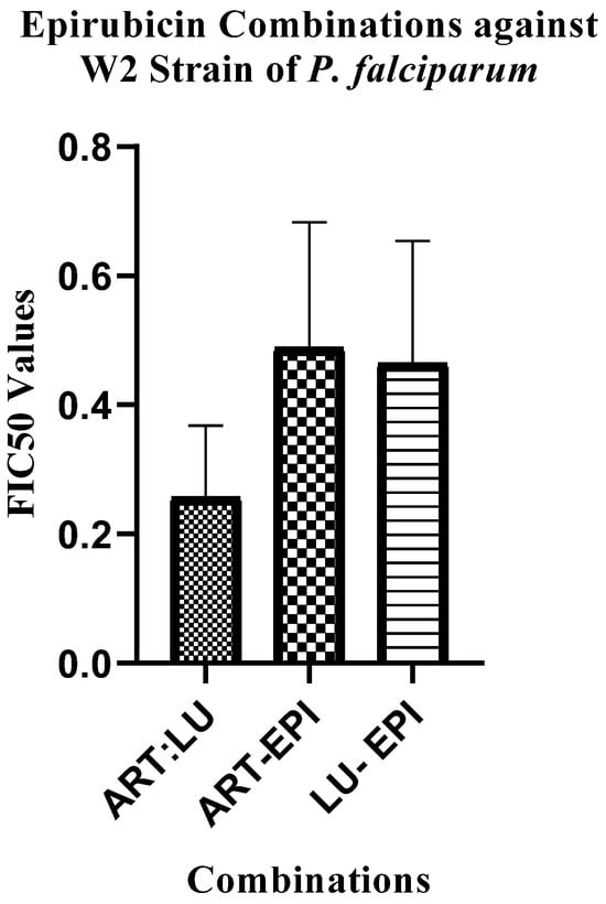 Substantial synergism was observed (FIC50 < 0.7) in most combinations of epirubicin (EPI) with artemether (ART) and lumefantrine (LU) across different fixed drug–drug ratios when tested ex vivo against fresh field isolates and in vitro against different strains of P. falciparum (Table 1, Figure 1). The combinations against different strains of P. falciparum and clinical isolates showed FIC50 values of <0.7 that were significantly different (p value = 0.0016). The displayed synergism suggests the drugs used in combination potentiate each other towards increasing the overall observed antiplasmodial activities than when the drugs are tested alone. This portrays a potential use of epirubicin in antimalarial drug combinations.