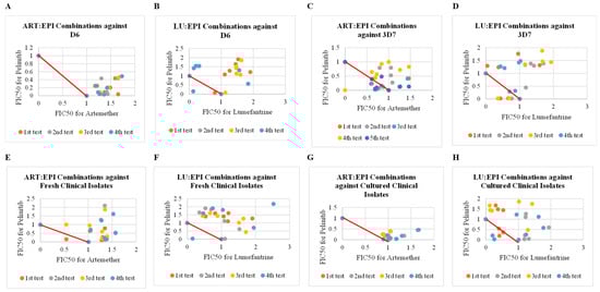 The most notable synergistic effect was observed when LU was combined with EPI and tested against P. falciparum (3D7 strain) with a mean of mean sum FIC50 of 0.18 across all fixed ratios (Table 1, Figure 1C). Specifically, the drug–drug (LU:EPI) combination ratios of 1:1, 1:2, and 1:3 yielded mean sum FIC50 values of 0.058, 0.1, and 0.09, respectively, indicating the highest degree of synergism among the combinations tested (Table 1). However, some combinations showed additivity and antagonism as observed in scatter plots in Figure 1.