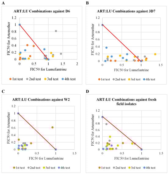 Scatter plots of artemether combined with lumefantrine against different strains of P. falciparum and field isolates. D6 and 3D7 = mefloquine-resistant; chloroquine-sensitive strains of P. falciparum; W2 = chloroquine-resistant, mefloquine-sensitive and artemisinin-sensitive Indochina strain of P. falciparum; Plots below the red line indicate synergism, plots along the red line indicate additivity, and plots above the red line indicate antagonism. (A) Artemether and lumefantrine combinations against D6 strain of P. falciparum. (B) Artemether and lumefantrine combinations against 3D7 strain of P. falciparum. (C) Artemether and lumefantrine combinations against W2 strain of P. falciparum. (D) Artemether and lumefantrine combinations against clinical isolates.