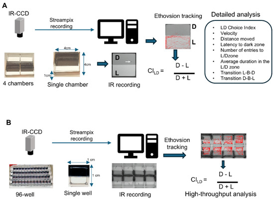 Comparison of the conventional light-dark preference assay vs the 96-well plate assay. (A) Schematic of light/dark choice behavior assay carried out in conventional 4 cm × 4 cm behavior chambers, allowing detailed analysis of the behavior. (B) Schematic of light/dark choice behavior assay carried out in a customized 96-well plate for high-throughput analyses.