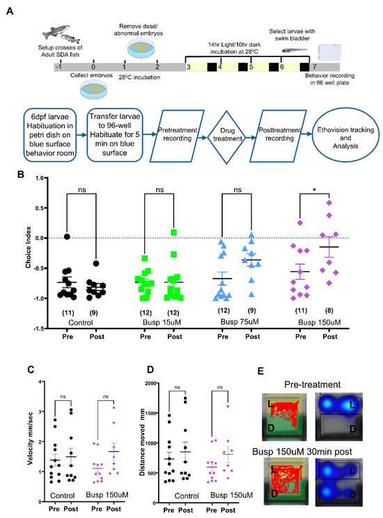Validation of 96-well light/dark choice behavior assay with known anxiolytic Buspirone: (A) schematic showing larvae raising and preparation for the 96-well plate light/dark behavioral assay. (B) Scatter plot showing light/dark choice index comparisons of pre and post-treatment groups, numbers in parentheses indicate the number of larvae corresponding to the treatment group. (C) Scatter plot for velocity and (D) distance moved by larvae during the recording. Mixed-effects model (REML) and Šídák’s multiple comparisons test, * p < 0.05, ns—non significant. (E) Example of tracks and heatmap.
