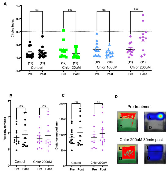 Validation of 96-well light/dark choice behavior assay with known anxiolytic Chlordiazepoxide: (A) scatter plot showing light/dark choice index comparisons of pre and post-treatment groups, numbers in parentheses indicate the number of larvae corresponding to the treatment group. (B) Scatter plot for velocity and (C) distance moved by larvae during the recording. Mixed-effects model (REML) and Šídák’s multiple comparisons test, *** p < 0.001, ns—non significant. (D) example of tracks and heatmap.