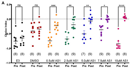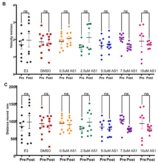 Effect of the new compound AS1 on LD choice behavior in 96-well plate assay. (A) Scatter plot showing light/dark choice index comparisons of pre and post-treatment groups, numbers in parentheses indicate the number of larvae corresponding to the treatment group. (B) Scatter plot for velocity and (C) distance moved by larvae during the recording. Mixed-effects model (REML) and Šídák’s multiple comparisons test, * p < 0.05, ** p < 0.01, *** p < 0.001, **** p < 0.0001, ns—non-significant.