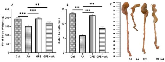 Effect of GPE on final body weight (A) and colon length (B) in AA-induced UC rats. Data expressed as mean values ± SD (n = 6/group). ** = p < 0.001 and *** = p < 0.0001 vs. the AA group. Representative pictures of colon length (C) in all experimental groups.
