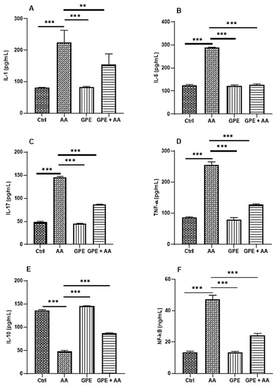Effect of GPE on pro- and anti-inflammatory mediators (A) IL-1, (B) IL-6, (C) IL-17, (D) TNF-α, (E) IL-10, and (F) the transcription factor NF-κB in AA-induced UC rats. Data expressed as mean values ± SD (n = 6/group). ** = p < 0.001 and *** = p < 0.0001 vs. the AA group.