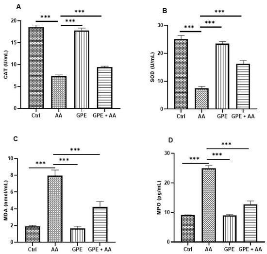 Effect of GPE on oxidative stress biomarkers (A) CAT, (B) SOD, (C) MDA, and (D) MPO in AA-induced UC rats. Data expressed as mean values ± SD (n = 6/group). *** = p < 0.0001 vs. the AA group.