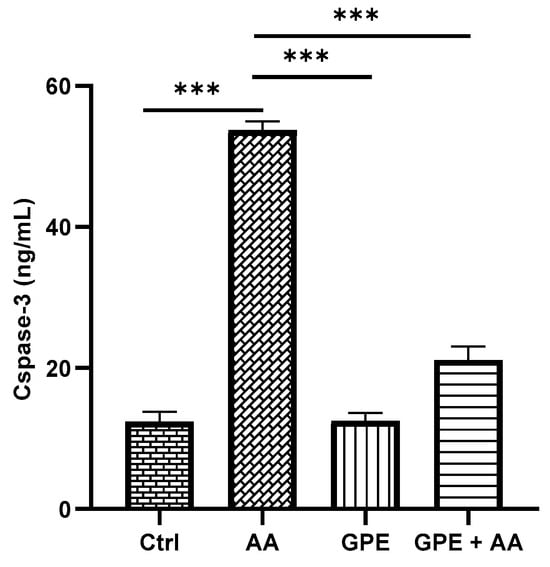 In comparison with the Ctrl group, the level of caspase-3 in AA group showed a highly significant increase. On the contrary, treatment with GPE resulted in a highly significant decrease in the level of caspase-3 in the GPE + AA group compared to the AA group (Figure 5). However, the level of caspase-3 was not completely recovered back to normal levels in the GPE + AA group, where a significant difference (p < 0.001) was observed in comparison with the Ctrl group.