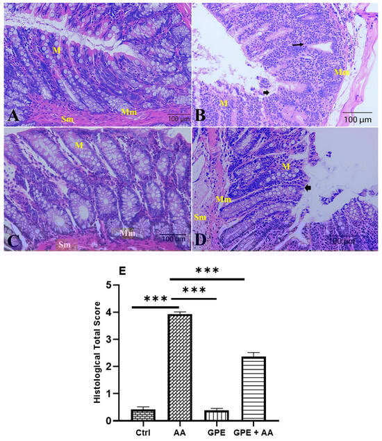 Photomicrograph of histologically analyzed H&E-stained colon sections in all experimental groups: (A) control rats (Ctrl group) showing normal mucosal structure with intact epithelial surface (M), muscular layer (Mm), and submucosa (Sm); (B) rats with AA-induced colitis (AA group) showing histopathological alterations evidenced by severe mucosal damage, loss of goblet cells (arrowheads), and necrosis of mucosa (M) associated with marked infiltration of mononuclear cells (arrow); (C) GPE-treated rats (GPE group) showing almost nearly normal mucosal structure (M), muscular layer (Mm), and submucosa (Sm); (D) GPE-treated rats with colitis (GPE + AA group) showing improvement in histological structure with slight loss of some surface columnar epithelial cells (arrowhead) and minimal necrosis of mucosa (M). Original magnification: 100×. (E) Scoring of histology sections. Data expressed as mean ± SD (n = 6/group). *** = p < 0.0001 vs. AA group.