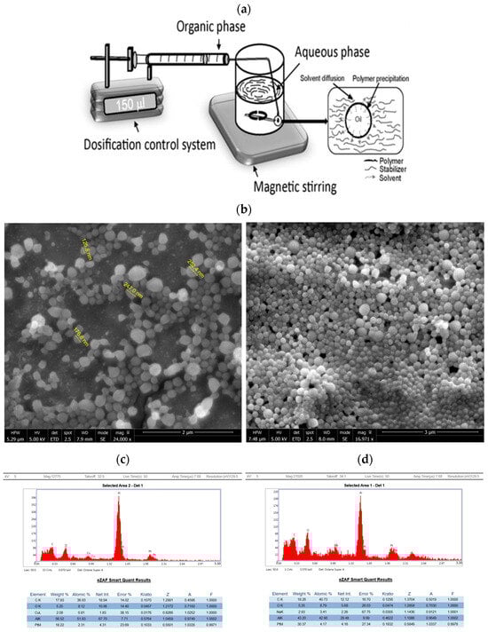 Experimental setup and physical characteristics of quercetin nanocapsules. (a): Experimental setup of the nanoprecipitation method. (b): SEM images showing close-ups of the quercetin nanocapsules and their size. (c): EDS analysis of empty nanocapsules. (d): EDS analysis of quercetin nanocapsules. (e): DLS size distribution of quercetin nanocapsules at a count rate (kcps) of 521.4 with a baseline index of 8.2. (f): Zeta potential distribution of quercetin nanocapsules at 683 μS conductance, 4.00 V voltage, 640 nm wavelength, and 2.00 Hz field frequency.