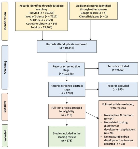 A more refined selection process was carried out during the abstract screening phase. Each abstract was reviewed for the use of AI techniques in the context of drug discovery or development and the presence of meaningful scientific or therapeutic contributions. As a result, 975 records (75.7% of abstracts reviewed) were excluded because they did not meet these criteria. The remaining 313 articles (24.3% of abstracts screened; 1.6% of the original dataset) were retained for full-text review. The full-text review phase involved a detailed assessment of the study’s methodology, focus, and outcomes. From these 313 full-text articles, 140 articles (44.7%) were excluded. The reasons for exclusion were systematically categorized as follows: 94 articles (30.0% of full texts assessed; 67.1% of exclusions) did not utilize adaptive AI methods, such as reinforcement learning (RL), generative adversarial networks, or other self-improving algorithms, which were key inclusion criteria. Twenty-eight articles (8.9% of full texts; 20.0% of exclusions) were unrelated to drug discovery or development applications. These included AI use in other domains such as medical diagnostics or image analysis, without clear links to pharmaceutical pipelines. Eighteen articles (5.8% of full texts; 12.9% of exclusions) lacked measurable drug development outcomes, such as predictive performance, lead optimization, or translational results, rendering them insufficiently aligned with the review objectives. Following this rigorous filtering process, 173 studies were deemed eligible and subsequently included in the final scoping review. This constitutes 55.3% of the full-text articles assessed, and only 1.8% of the total records identified at the outset. Despite the relatively small final inclusion rate, this subset of studies provides a focused and high-quality evidence base for analyzing how adaptive AI methods are currently integrated within the pharmaceutical research and development landscape. These selected studies form the basis of the subsequent analysis on methodological trends, therapeutic targets, and measurable impacts of AI in modern drug discovery.