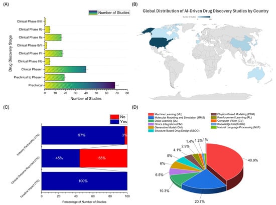 A comprehensive analysis of the 173 included studies reveals valuable insights into how AI is applied throughout various stages of drug development, its geographic distribution, the degree of industry partnership, translational impact, and the spectrum of AI methodologies employed. Figure 2A provides a comprehensive overview of the distribution of AI applications across various stages of drug development, with an intense concentration in the early phases of the drug discovery pipeline. The preclinical stage remains the most active, with 68 out of 173 studies (39.3%) focused at this level. This highlights AI’s integral role in the foundational aspects of drug research, including target identification, virtual screening, de novo molecule generation, molecular docking, quantitative structure–activity relationship (QSAR) modeling, and ADMET prediction. The dominance of preclinical AI applications underscores its transformative potential in accelerating early-stage discovery and optimizing lead compounds before entering human trials. Next, 19 studies (11.0%) were positioned in the transitional phase between preclinical and Clinical Phase I, often associated with IND (Investigational New Drug) enabling activities. At this stage, AI is applied in predictive toxicology, in silico dose selection, early biomarker discovery, and simulation of pharmacokinetic parameters, contributing to safer and more informed transitions into human testing.