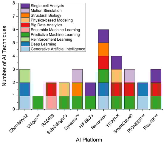 Diversity of AI techniques utilized across leading AI drug discovery platforms. This figure presents a comparative analysis of the number and variety of AI techniques implemented by major AI platforms in drug discovery. Each bar represents a distinct AI platform, and each colored segment within the bars corresponds to a specific AI technique.