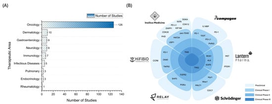 Figure 4B complements this therapeutic overview with a flower plot that maps the molecular targets pursued by leading AI-powered drug discovery companies. This visualization illustrates how AI is being used to expand therapeutic areas and diversify molecular strategies. The flower’s petals are divided among six prominent AI-driven biopharmaceutical firms: Insilico Medicine, Compugen, Schrödinger, Lantern Pharma, HiFiBiO Therapeutics, and Relay Therapeutics. Each sector’s molecular targets are placed according to their development phase, ranging from preclinical (light blue) to clinical phases I through III (in increasingly darker shades of blue). Notably, specific targets such as PD-1, PD-L1, TYK2, and EGFR appear in multiple petals, signaling their importance across company pipelines and suggesting convergence on high-value targets in immuno-oncology and precision medicine. The recurrence of targets like PD-1 and PD-L1, central to immune checkpoint inhibition therapies, indicates that AI is used to identify new molecules and optimize well-known mechanisms of action. Their widespread inclusion across companies and development stages signals intense competition and the strategic prioritization of validated but improvable pathways. Similarly, TYK2 and EGFR represent attractive targets with known therapeutic relevance in autoimmune and oncologic conditions [93,94], further reinforcing that AI enhances and accelerates drug discovery within proven biological frameworks. Additionally, more specialized or emerging targets, such as pan-TEAD, CDC7, and MALT1, demonstrate that AI is also facilitating novel hypothesis generation and target validation, which may yield first-in-class therapies.