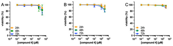Viability of cell lines exposed to compound 4. Human U87 MG (A), A375 (B) cell lines, and human fibroblasts (C) were treated with compound 4 (0.1–300 μM) for different times (24–72 h), and cell viability was assessed by MTT assay. Results are the mean ± SEM of three independent experiments, each performed in triplicate.