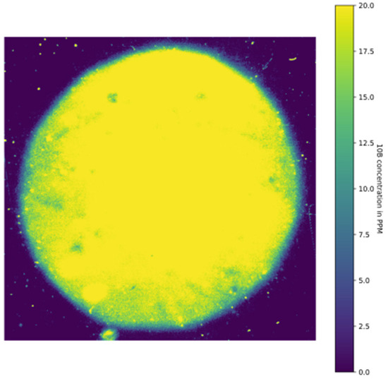 Macroscopic images of the entire sample were obtained using a Leica stereomicroscope; the size of images ranges between 30 and 50 mm2, representing boron distribution within the pellet to investigate its uniformity. The qualitative map has thus been converted into colors associated with boron concentration ranges with the Viridis Matplotlib (3.10.3) color map.