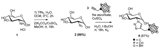 Commercial glucosamine was first functionalized with an azido group following a reported procedure [16]. For the synthesis of the target compound 4, an effective approach was used to obtain a wide range of biologically active compounds, namely the Cu(I)-catalyzed azide–alkyne cycloaddition reaction (click chemistry) [17]. Compound 2 was reacted with propargyl-ortho-carborane 3 [18] in a mixture of water and t-BuOH with the addition of sodium ascorbate and copper sulphate under a nitrogen atmosphere. The mixture was stirred for 18 h at rt. An improvement in yield over previous attempts was obtained by degassing the solvents before starting the reaction. In detail, before the addition of a solution of copper sulphate, the mixture was put under vacuum for 15 min and then fluxed under a nitrogen atmosphere. The final compound 4 is a mixture of two anomers (α and β), as glucosamine exists as a hemiacetal in equilibrium with its open form when in an aqueous medium. NMR data are provided in the Supporting Information (SI), (Scheme 1).