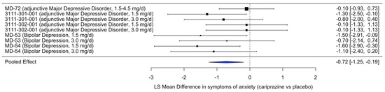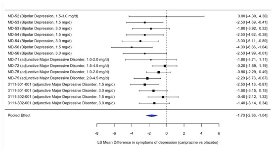 In the major depressive disorder add-on studies, pooled data on MADRS could not be retrieved. Of the overall five studies, two individual studies showed statistically significant results versus placebo. In study 3111-301-001 [52], adjunctive cariprazine 1.5 mg/d compared with placebo resulted in significantly greater mean reductions in MADRS Total Score from baseline to Week 6 (LSMD = −2.5, 95% CI [−4.2, −0.9], p = 0.0025). Cariprazine 3.0 mg/d versus placebo reached numerically greater reductions in MADRS Total Score; however, this difference did not reach statistical significance (LSMD = −1.5, 95% CI [−3.2, 0.1], p = 0.0691) [52]. In MD-75 [51], patients taking cariprazine at doses of 2.0–4.5 mg/d showed significantly greater mean reductions in the MADRS Total Score compared to placebo by Week 2 and at all subsequent visits. By Week 8, the LSMD for the cariprazine 2–4.5 mg/day group versus placebo was –2.2 (95% CI [–3.7, –0.6], p = 0.0057). In contrast, the LSMD for the cariprazine 1.0–2.0 mg/d group at Week 8 was –0.9 (95% CI [–2.4, 0.6], p = 0.2404) [43].