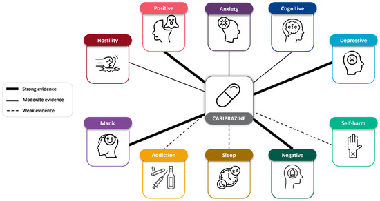 To interpret the efficacy of cariprazine on transdiagnostic symptoms, three categories for the strength of evidence were defined: Strong evidence was defined as the presence of randomized controlled trials (RCTs) specifically designed to evaluate the symptom domain in question, conducted in a relevant and vulnerable patient population. Moderate evidence was assumed if findings were consistent across disorders but were derived from trials not specifically targeting the symptom domain or symptom-specific populations, or if symptom measurement relied on non-specific scales. Weak evidence was assumed when data came from non-RCTs or when limitations in design or measurement reduced interpretability.
