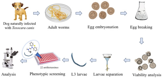 Experimental workflow for evaluating antihistamine activity against Toxocara canis L3 larvae. Adult worms were collected from naturally infected dogs, and their eggs were isolated and embryonated to the infective larval stage. A total of 22 antihistamines were screened, leading to the selection of promethazine and rupatadine for EC50 determination.