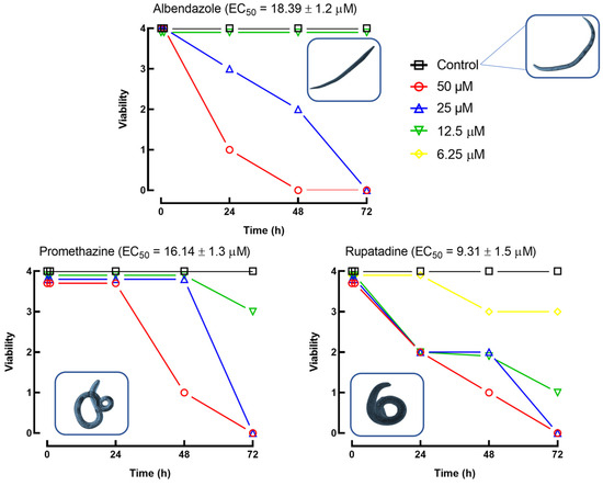 The time- and concentration-dependent effects of albendazole, promethazine, and rupatadine on L3 larval viability are shown in Figure 3. Viability was scored on a scale from 4 (fully active) to 0 (dead). At 50 µM, all three compounds induced complete immobility (score 1) within 24 h and lethality (score 0) by 48 h. Despite this similar temporal pattern, the compounds exhibited distinct potencies and effects at lower concentrations.