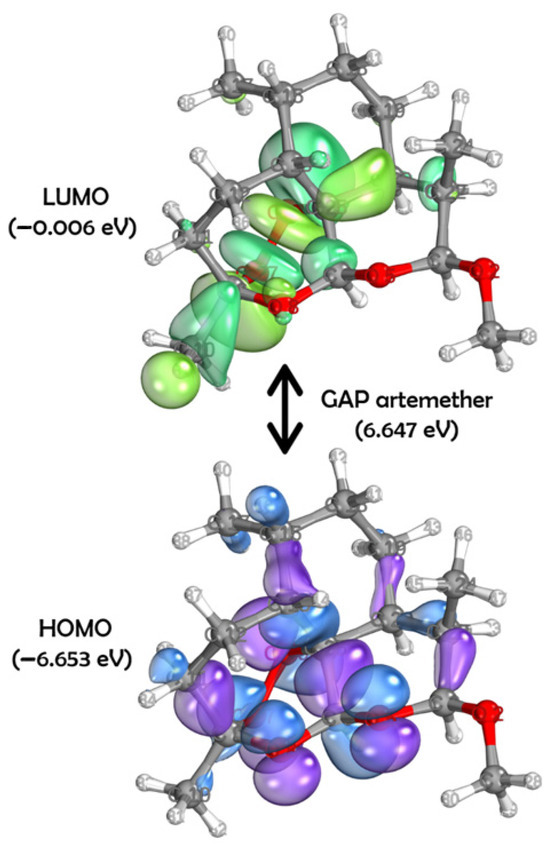 Surfaces of HOMO and LUMO to artemether ((1R,4S,5R,8S,9R,10S,12R,13R)-10-methoxy-1,5,9-trimethyl-11,14,15,16-tetraoxatetracyclo [10.3.1.04,13.08,13]hexadecane), obtained through the DFT method using the set of basis functions def2-TZVPP and functional B3LYP. For HOMO: in purple, positive phases; in blue, negative phases. For LUMO: In dark green, positive phases; in light green: negative phases.