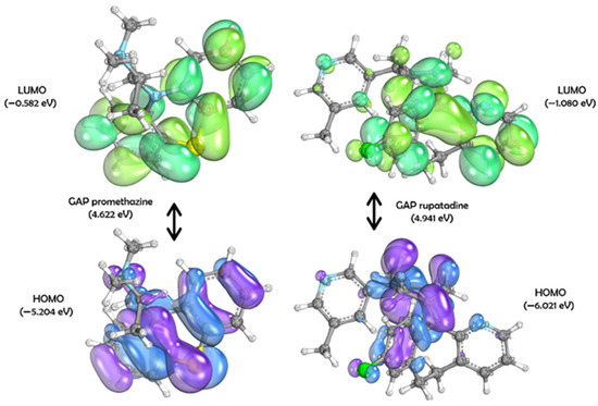 As shown in Figure 5, promethazine and rupatadine displayed smaller energy gaps: 4.622 eV and 4.941 eV, respectively. Promethazine has HOMO = −5.204 eV and LUMO = −0.582 eV, while rupatadine has HOMO = −6.021 eV and LUMO = −1.080 eV. For promethazine’s HOMO, Py contributions were observed on atoms N4, C5, C10, S11, and C12, with additional S, Px, and Pz contributions on N4. In the LUMO, Px contributions were seen on C5, C7, S11, and C12; Pz on C10 and C17; S on C5, C10, C12, and C17; and Py on C5, C7, C10, C12, and C15.