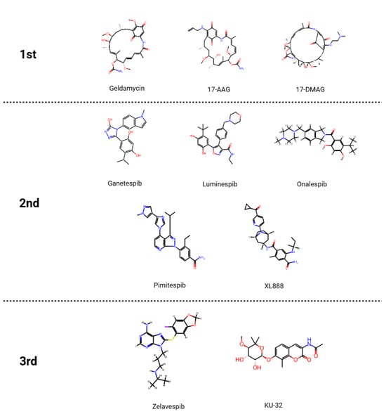 First-generation HSP90 inhibitors are represented by natural product-derived geldanamycin and its improved derivative 17-AAG, which directly bind to the N-terminal ATP-binding domain of HSP90 and inhibit its ATPase activity (Figure 1). When ATPase activity is inhibited, the binding between client proteins and HSP90 becomes unstable, and as a result, the client proteins are rapidly degraded via the ubiquitin–proteasome system [12]. However, the problems of low water solubility and high hepatotoxicity have limited their clinical application [13].