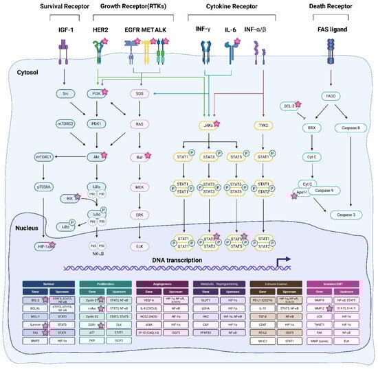 A schematic representation of receptor-mediated oncogenic signaling pathways and transcriptional regulation in cancer. The figure illustrates the major signaling axes activated by survival receptors (e.g., IGF-1R), receptor tyrosine kinases (HER2, EGFR, MET, ALK), cytokine receptors (e.g., IFN-γ, IL-6, IFN-α/β), and death receptors (e.g., FAS ligand). These pathways converge through downstream signaling mediators such as PI3K/Akt, RAS/RAF/MEK/ERK, JAK/STAT, NF-κB, and HIF-1α, regulating the transcription of genes associated with cancer hallmarks including cell survival, proliferation, angiogenesis, metabolic reprogramming, immune evasion, and invasion or epithelial–mesenchymal transition (EMT). The lower panel categorizes representative genes and their upstream regulators involved in each functional hallmark. The pink stars are Client molecules known to be directly inhibited by HSP90. IGF-1R: Insulin-like Growth Factor 1 Receptor; HER2: Human Epidermal Growth Factor Receptor 2; EGFR: epidermal growth factor receptor; MET: Mesenchymal–Epithelial Transition factor (or MET proto-oncogene, receptor tyrosine kinase; ALK: Anaplastic Lymphoma Kinase; INF-γ: Interferon-γ; INF-α/β: Interferon-α/β; IL-6: Interleukin 6; FAS ligand: Fas cell surface death receptor ligand; PI3K: phosphatidylinositol 3-kinase; Akt: Protein Kinase B (PKB), also called Akt, RAS: Rat Sarcoma viral oncogene homolog (small GTPase); Raf: Rapidly Accelerated Fibrosarcoma (serine/threonine-protein kinase); MEK: Mitogen-Activated Protein Kinase Kinase (MAPKK, e.g., MEK1/2 = MAP2K1/2); ERK: Extracellular Signal-Regulated Kinase (MAPK); JAKs: Janus Kinases (JAK1, JAK2, JAK3, TYK2); STAT1, 2, 3, 5: Signal Transducer and Activator of Transcription 1, 2, 3, 5; NF-κB: Nuclear Factor Kappa-Light-Chain-Enhancer of Activated B Cells; HIF 1α: Hypoxia Inducible Factor 1 Alpha [51,52,53,54,55,56,57,58].