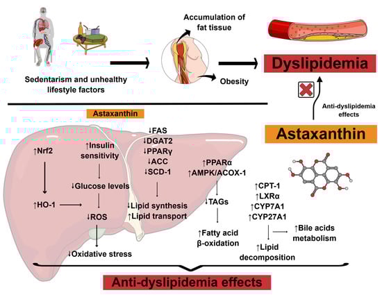 Nutritional management of dyslipidemia has been shown to improve overall metabolic health in patients, even without the use of lipid-lowering synthetic medications. These dietary strategies modulate relevant biomarkers involved in lipid production, and when combined with exercise regimens, medical nutrition therapies might be even more potentiated [14]. Bioactive compounds have gained significant interest in this context due to their multifaceted health effects [15]. Figure 2 illustrates the potential anti-dyslipidemia effects associated with astaxanthin supplementation and their corresponding mechanisms of action.