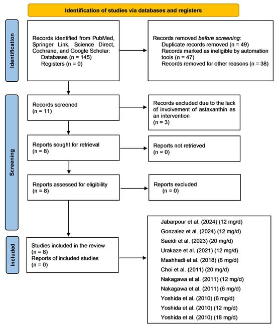 (S) All included studies were randomized and placebo-controlled or had a control group. We only included articles retrieved from reputable peer-reviewed journals and written in English. We excluded conference papers, abstracts, master’s dissertations, doctoral theses, descriptive studies, commentaries, case studies, editorials, and reviews. However, previous reviews on astaxanthin’s general effects were utilized to build some sections of our present manuscript, including the Introduction. The time range for the studies included the years until May 2025.