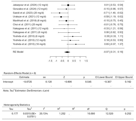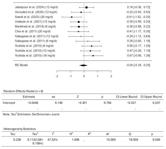 Eight studies comprising eleven results were included in the meta-analysis regarding total cholesterol intervention using astaxanthin. The standardized mean differences analysis ranged from −0.9100 to 0.6687; most estimates were negative (55%). While assessing the intervention, the estimated average standardized mean difference based on the random-effects model was calculated as −0.0448 (95% CI: −0.3369 to 0.2473). This means that the average outcome did not differ significantly from zero (z = −0.3007, p = 0.7636). Based on the results from the Q-test, it was observed that the outcomes appear to be heterogeneous, with statistical results from Q ranging from 19.0558, with a significance of p = 0.0396 (tau2 = 0.1142, I2 = 47.5225%). The 95% prediction interval for the outcomes was evaluated as a −0.7686 to 0.6790 interval. Therefore, although the average outcome is estimated to be negative, it may be positive in some studies. Examining the studentized residuals revealed that none of the studies included has a value larger than ±2.8376. This means there is no indication of outliers among the included studies. Cook’s distances reveal that no study included could be considered overly influential. Further analysis revealed that neither the rank correlation nor the regression test indicates asymmetry in the funnel plot (p = 0.3587 and p = 0.6918, respectively). Figure 6 illustrates the forest plot and other results for the meta-analysis assessing total cholesterol levels throughout the included studies.