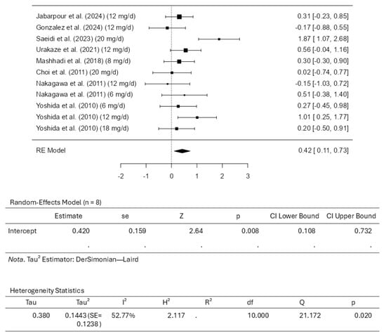 Eight studies comprising eleven results were included in the meta-analysis for HDL-C intervention using astaxanthin. The results observed a standardized mean difference from −0.1656 to 1.8731. The analysis demonstrated that most estimates were positive (82%). In this scenario, the estimated average standardized mean difference based on the random-effects model was 0.4200 (95% CI: 0.1081 to 0.7319). Therefore, it is worth noting that the average outcome differed significantly from zero (z = 2.6393, p = 0.0083). The Q-test revealed that the outcomes appear heterogeneous, with a Q(10) of 21.1719 (p = 0.0199, tau2 = 0.1443, I2 = 52.7675%). Using a 95% prediction interval, the outcomes are given from −0.3872 to 1.2272. This means that although the average outcome is estimated to be positive, the actual outcome may be negative in some studies. An examination of the studentized residuals revealed that the survey conducted by Saeidi et al. [31], which assessed the dosage of 20 mg/d of astaxanthin, has a value larger than ±2.8376 and may represent a potential outlier in the context of this model. Cook’s distances indicated that none of the studies could be overly influential. Further analyses revealed that neither the rank correlation nor the regression test indicates any funnel plot asymmetry, with p-values of 0.8793 and 0.6559, respectively. Figure 5 illustrates the forest plot and other results for the meta-analysis assessing HDL-C levels throughout the included studies.