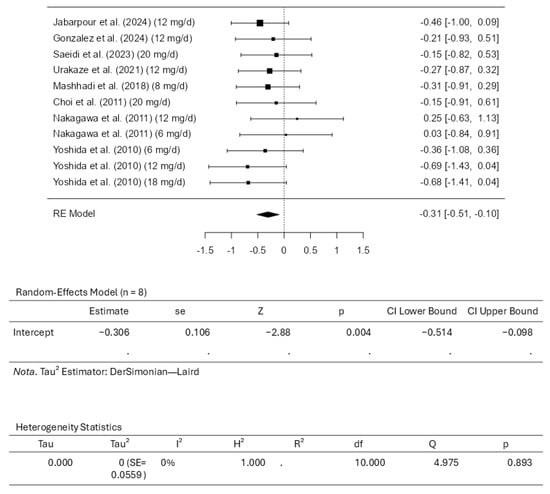 Eight studies comprising eleven results were included in the meta-analysis assessing the triglyceride intervention with astaxanthin. A standardized mean difference ranged from −0.6942 to 0.2459, with most estimates being negative (82%). An estimated average standardized mean difference based on the random-effects model was calculated as −0.3058 (95% CI: −0.5138 to −0.0978). This means that the average outcome differed significantly from zero (z = −2.8816, p = 0.0040). According to the Q-test, the outcomes had no significant heterogeneity (4.9752, p = 0.8928, tau2 = 0.0000, I2 = 0.0000%). Examining the studentized residuals revealed that none of the studies has a value larger than ±2.8376, which means there is no indication of outliers. Cook’s distances reveal that none of the studies could be considered overly influential. Neither the rank correlation nor the regression test indicates any funnel plot asymmetry (p = 0.2830 and p = 0.3224, respectively). Figure 7 illustrates the forest plot and other results for the meta-analysis assessing triglyceride levels throughout the included studies.