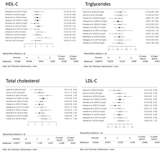 A dose-response meta-analysis was conducted to evaluate the effects of moderate to high doses of astaxanthin (6 to 20 mg/d) on the positive (HDL-C and triglycerides) and negative (LDL-C and total cholesterol) outcomes in the present study. Figure 8 gives the forest plots from these analyses. Controlling the doses of the astaxanthin supplementation did not alter the outcome measure. Therefore, controlling the dose of the supplement did not alter the previously mentioned results.