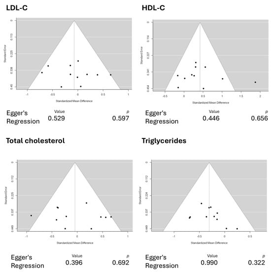 Funnel plot analyses for the reported outcomes. The funnel plots depict no plot asymmetry, indicating good reliability in the reported results. Abbreviations: HDL-C, high-density lipoprotein cholesterol; LDL-C, low-density lipoprotein cholesterol.