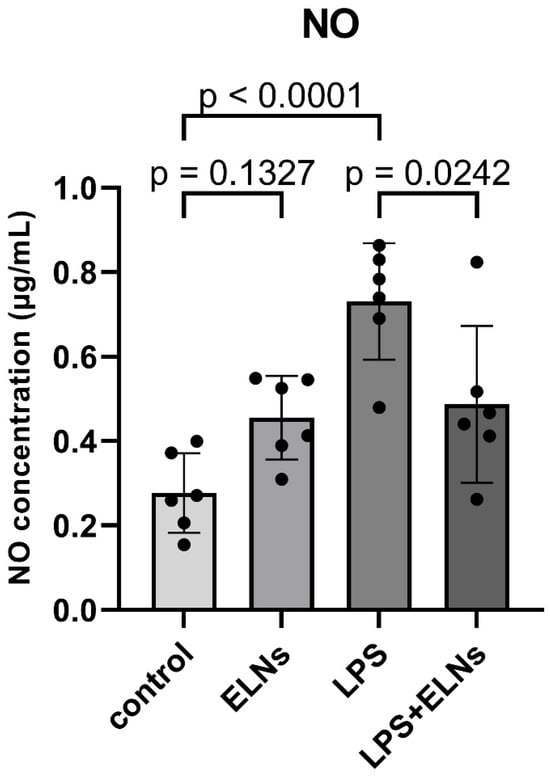 To examine the anti-inflammatory effects of ALR-ELNs, we measured the production of NO, a mediator of inflammatory responses. The NO level in the LPS group was significantly higher than that in the control group (p < 0.0001), and it was significantly lower in the LPS+ELN group than that in the LPS group (p = 0.0242) (Figure 1). This finding suggests that ALR-ELNs can suppress LPS-induced inflammatory responses.