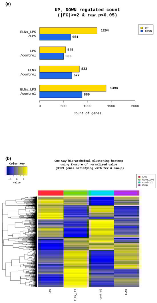 The trimmed reads were mapped to the mouse genome (mm10) using HISAT2 version 2.1.0 (https://ccb.jhu.edu/software/hisat2/index.shtml; accessed on 21 October 2024). Transcript assembly and expression quantification were performed using StringTie version 2.1.3b (https://ccb.jhu.edu/software/stringtie/; accessed on 21 October 2024) to identify novel and alternatively spliced transcripts in addition to known genes and transcripts. Fragments per kilobase of transcript per million mapped reads (FPKM) and transcripts per kilobase million (TPM) were used for expression normalization. DEGs were analyzed using edgeR (version 3.34.0) (a package of the statistical analysis software R (version 4.1.0)) with the following criteria: |fold change (FC)| ≥ 2 and exactTest raw p-value < 0.05. In total, four group comparisons were performed: LPS+ELN vs. LPS (1855 genes), LPS vs. control (1048 genes), ELN vs. control (1510 genes), and LPS+ELN vs. control (2283 genes). GO term enrichment analysis was performed using gProfiler (https://biit.cs.ut.ee/gprofiler/; accessed on 21 October 2024).