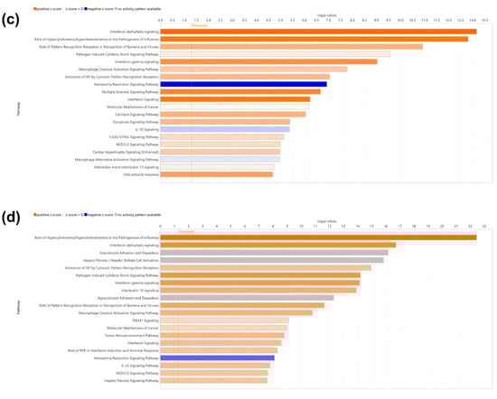 Figure 3. Effects of ALR-ELN treatment on immune response and signaling pathway activation. Bubble charts that show significantly enriched canonical pathway categories (Y axis) are listed according to the right-tailed Fisher’s exact test p-values (X axis; −log (p-value) > 1.3) as shown: (a) LPS+ELN vs. LPS and (b) ELN vs. control. Orange circles: positive-value z-score; blue circles: negative-value z-score; gray circles: zero-value z-score. Detailed information on molecules belonging to each pathway category is provided in Supplementary Table S1 (LPS+ELNs vs. LPS) and Table S2 (ELNs vs. control). The vertical axis represents the pathway classification category, and the size of each circle indicates the number of genes that overlap in each pathway. Horizonal bars indicate the top 20 significantly enriched canonical pathways (Y axis) listed according to their p-values (X axis; −log (p-value) > 1.3), (c) LPS+ELN vs. LPS and (d) ELN vs. control. Orange bars, predicted pathway activation z-score; blue bars, predicted pathway inhibition; gray bars, no activity prediction; white bars, pathways with z-scores at or very close to 0 or if there are fewer than four analysis-ready molecules, resulting in a z-score that cannot be calculated (z-score = NaN), respectively. Z-scores that are greater than or equal to 2 represent predictions of activation, whereas those less than or equal to −2 represent predictions of inhibition.