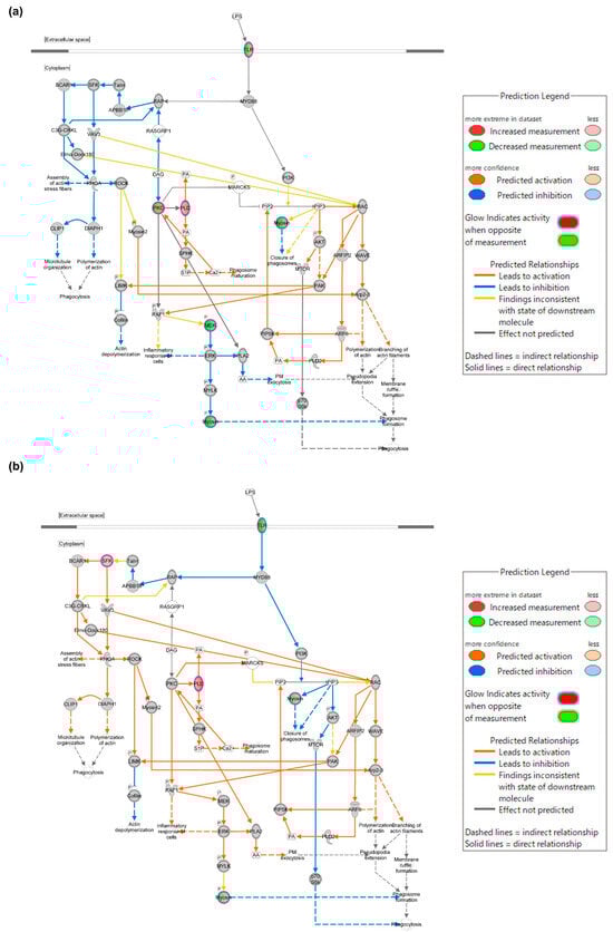 Figure 4. Mechanism through which ALR-ELNs suppress LPS-induced inflammation. Phagosome formation network regulated by TLR. Experimental upregulated (pink) and downregulated (green) DEGs in LPS-stimulated BV-2 cells pretreated with ALR-ELNs. Predicted upregulated and downregulated genes according to the molecular activity predictor are depicted in orange and blue, respectively. (a) LPS+ELN vs. LPS and (b) ELN vs. control. A double circle indicates that the molecule belongs to a family.