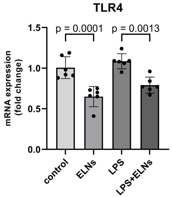 The effect of ALR-ELNs on TLR4 mRNA expression was examined using a real-time quantitative polymerase chain reaction (qPCR). The LPS+ELN group showed significantly lower TLR4 mRNA expression than the LPS group (LPS+ELNs vs. LPS: p = 0.0013). Similarly, the ELN group showed significantly lower TLR4 mRNA expression than the control group (ELNs vs. control: p = 0.0001) (Figure 5).